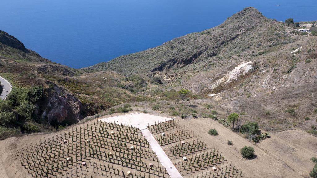 It is a twofold initiative involving both the planting of a new alberello-trained vineyard with a density of 1.20 x 1.20 meters, located directly in front of the winery entrance, where we have mainly planted red grape varieties — in particular Corinto and Pinot Noir — and the creation of sixteen spaces among the vines, which will be transformed into west-facing stations, and therefore oriented toward the sunset.
